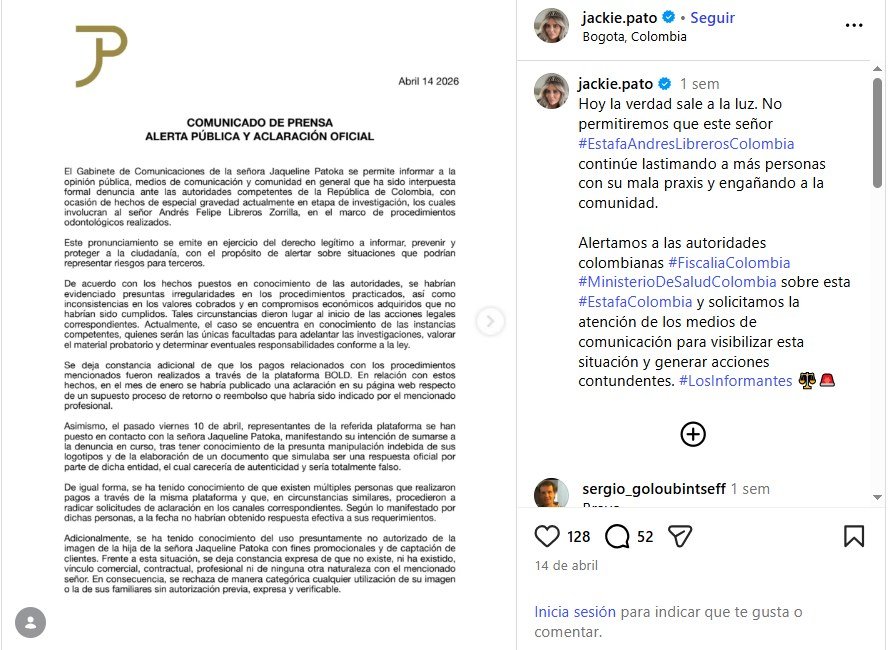 El Gabinete de Comunicaciones de la señora Jaqueline Patoka emitió una alerta pública oficial tras interponer una denuncia formal ante las autoridades de la República de Colombia. La acción legal surge a raíz de hechos de especial gravedad relacionados con procedimientos odontológicos realizados por el señor Andrés Felipe Libreros Zorrilla.